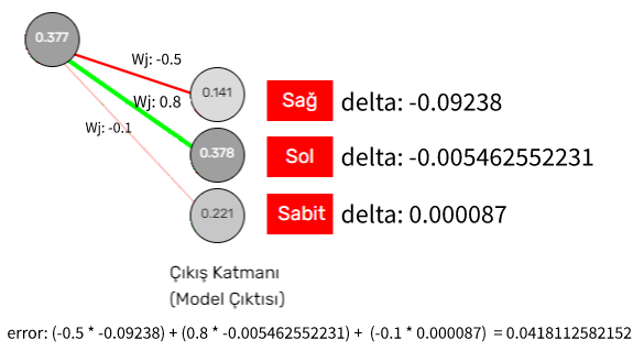 Bir sonraki adım error değeri hesaplanan nöronun delta değerini bulmaktır. Delta değeri, nöronun error değeri ile z değerinin sigmoid fonksiyonunun türevine tabi tutulmuş haliyle çarpılmasıyla bulunur.